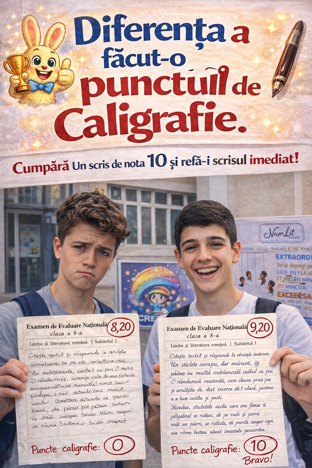 Știi că poți pierde puncte la examen… chiar dacă scrii corect! Un punct la matematică și unul la Română. ⏳ Nu mai e timp de amânat. Nu mai e „mai vedem”. Nu mai e „lasă că merge și așa”. 👉 Este ULTIMUL MOMENT în care mai poți schimba ceva. ✍️ Un scris de Nota 10 te ajută să-ți refaci scrisul în câteva zile și să NU pierzi puncte la EXAMENUL care urmează. Pentru că diferența nu se face doar la cât știi. Se face la: 👀 cât de clar se înțelege scrisul tău 📄 cât de ușor corectează profesorul 😔 Și uneori… diferența dintre o notă bună și una mediocră este FIX acel punct pierdut la scris. 🎯 Acel punct înseamnă: 👉 un liceu bun sau 👉 un an greu, cu compromisuri 🔥 Nu pierde ce ai muncit un an întreg dintr-un lucru pe care îl poți corecta ACUM. Cel mai bine investiți 78 lei, mai ieftin decât ora de meditație! Nu mai aștepta! https://numlit.eu/