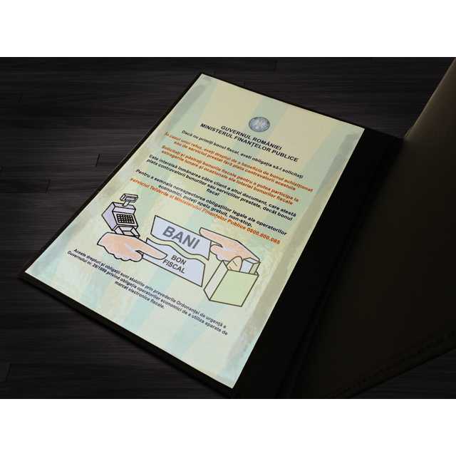 piele ecologica tip Balacron - economic Finisari Interioare :fete interioare indicative legale obligatorii: Bon fiscal alergeni. Optional Piele sintetica la culoare meniu.Accesoriile din fotografia de prezentare nu sunt incluse in pretul afisat . Ele pot fi solicitate completand rubrica Customizare Personalizare:Va recomandam personalizarea interiorului de coperta cu reclame la produsele Dvs. Coperta :cu FOLIO , culori disponibile personalizare : Auriu, Argintiu, Albastru, Verde , Rosu.Imprimare UV - pentru coperti din materiale netexturate