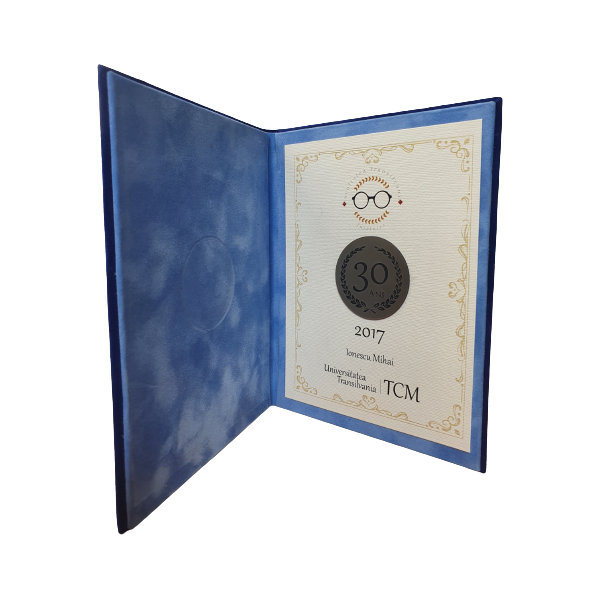 Placheta cuprinde insert Abs la dimensiunile 97 x 147 mm gravat , diploma tiparita pe carton special si incao mica gravura complementara, pentru un efect special