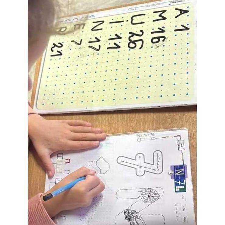 tabel cu pătrate de culoare albastra ( identifică vocale) şi culoare rosie (consoane) pe care sunt scrise literele alfabetului. Central-jos pe fiecare jeton cu literă este scris numărul corespunzător poziţiei ei în alfabet.