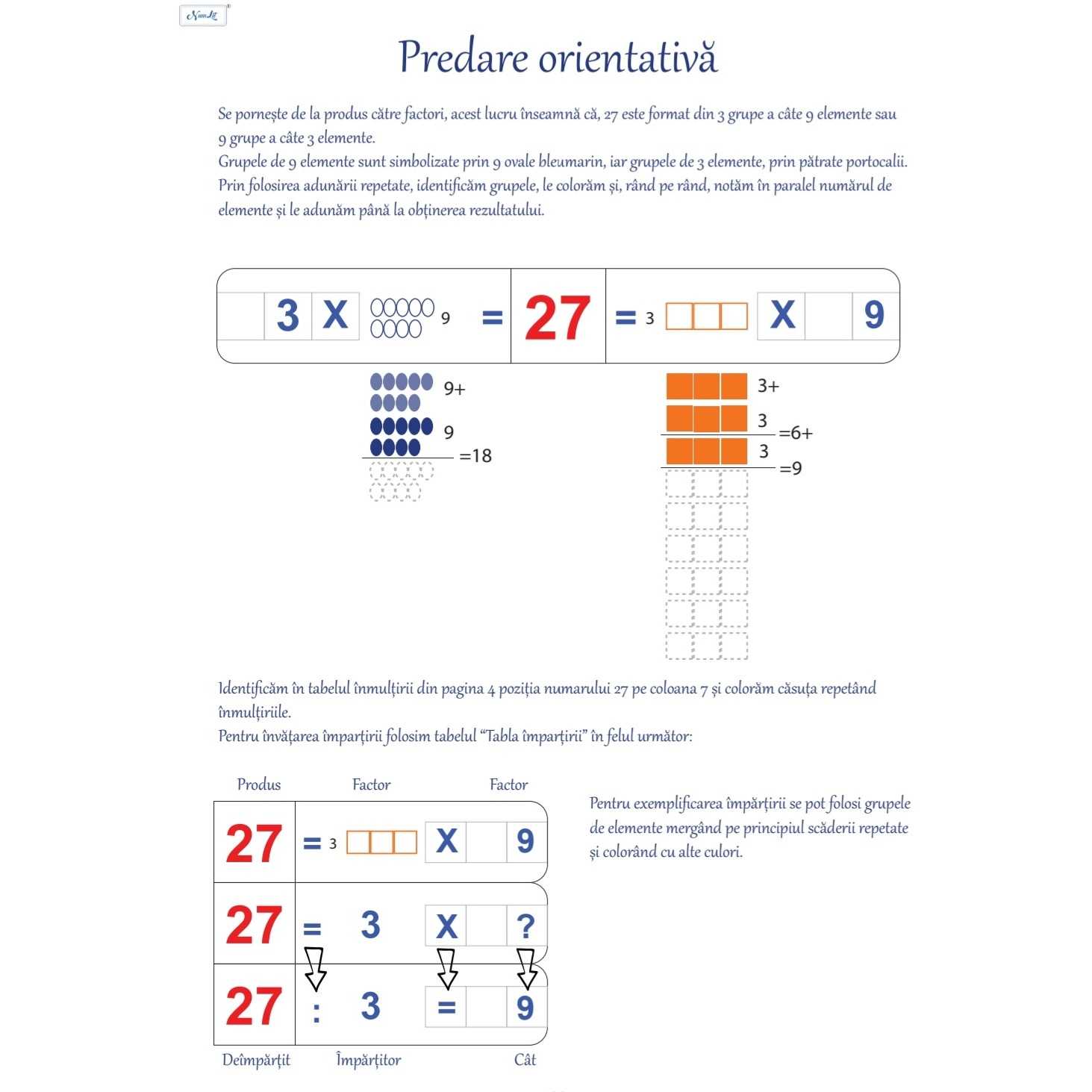 • copilul află că termenii unei înmulțiri se numesc factori, iar rezultatul –produs
