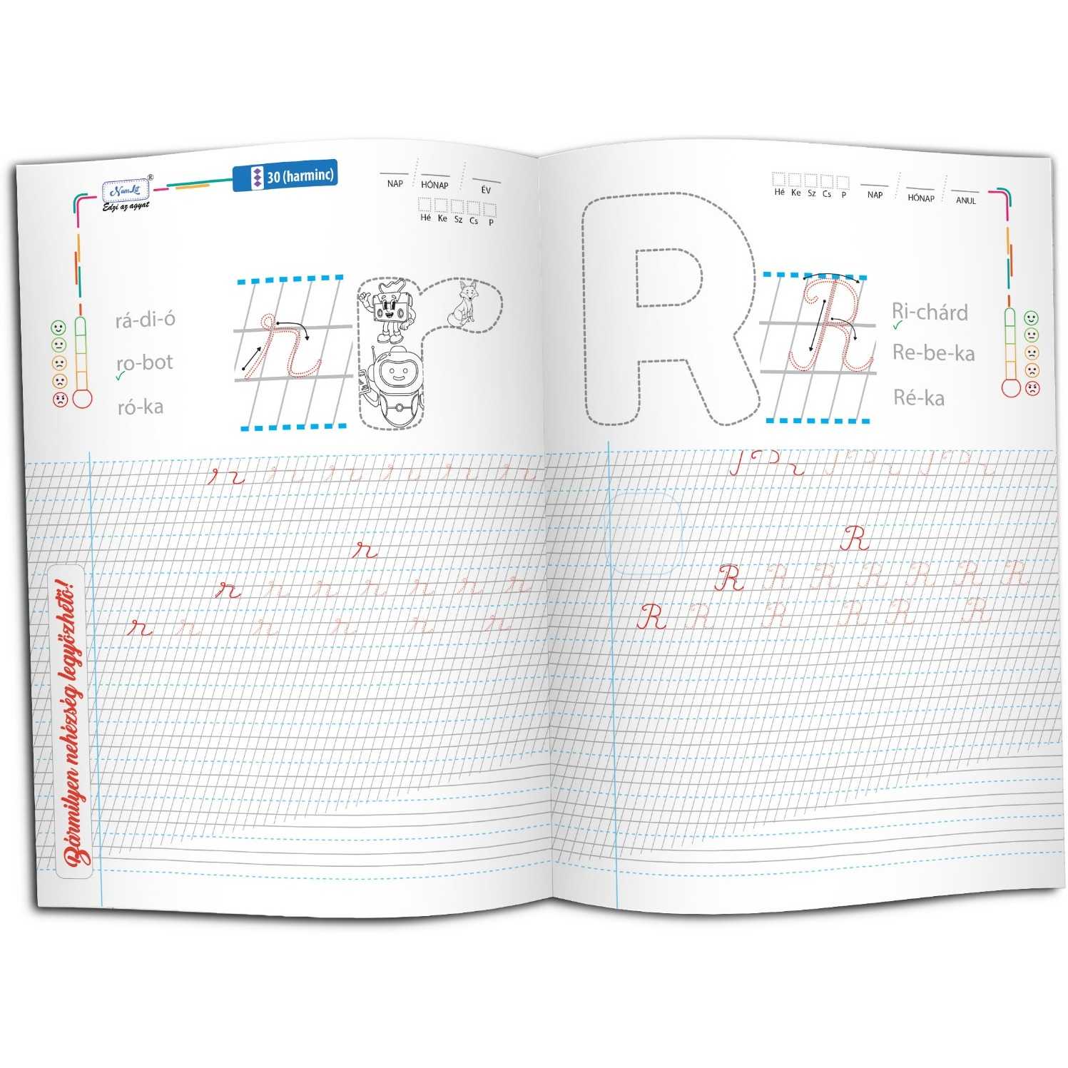 - Előírt betűket, amelyek segítségével vezetett tanulással gyakorolhatók.